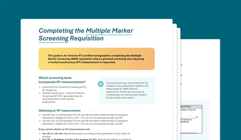 As a registered sonographer, you can submit NT / CRL measurements on Multiple Markers Screening requisitions under your own Ontario NT ID number. It is important to be aware of how to complete the requisition accurately and thus have a positive impact on the care of pregnant individuals.
