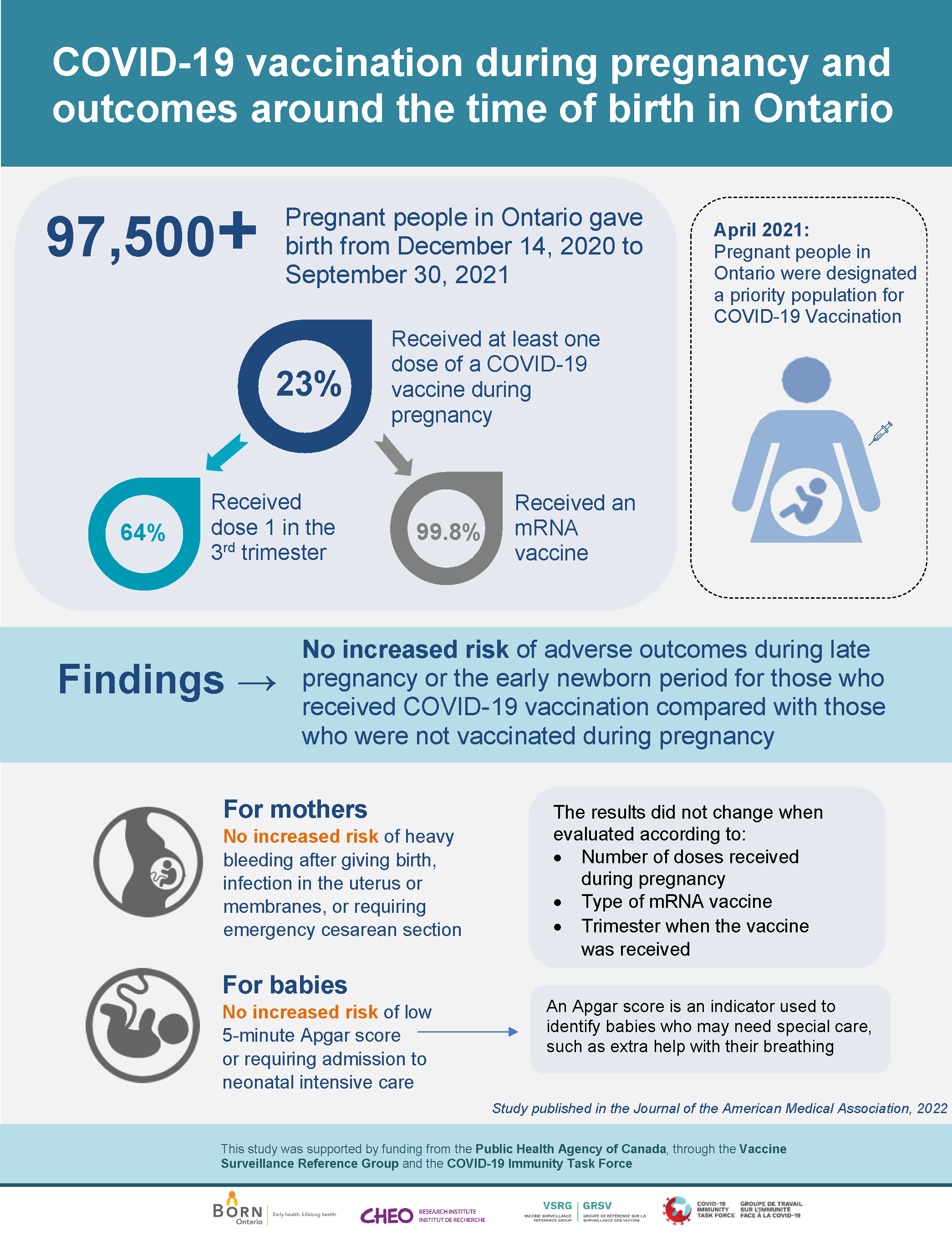 - No increased risk of adverse outcomes during late pregnancy or the early newborn period for those who received COVID-19 vaccination compared with those who were not vaccinated during pregnancy