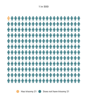 A number on the report gives your specific chance that the baby has trisomy 21. For example: You got a "screen negative" result for trisomy 21, and the number on your report is 1 in 500. This means out of 500 people who get this result, 1 will have a pregnancy with trisomy 21, and the other 499 people will not (see figure). You can also think of it as a 0.2% chance for the baby to have trisomy 21, and a 99.8% chance for the baby to not have trisomy 21. |